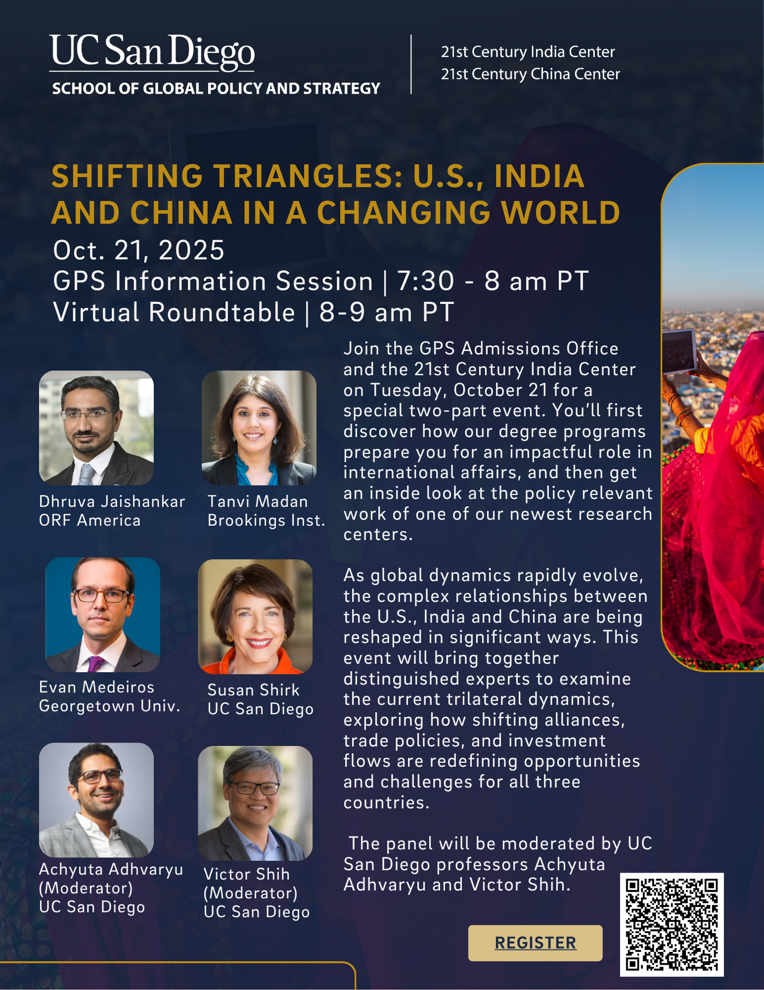 Join the GPS Admissions Office and the 21st Century India Center on Tuesday, October 21 for a special two-part event. You’ll first discover how our degree programs prepare you for an impactful role in international affairs, and then get an inside look at the policy relevant work of one of our newest research centers.GPS Information Session (7:30 - 8 am PT)